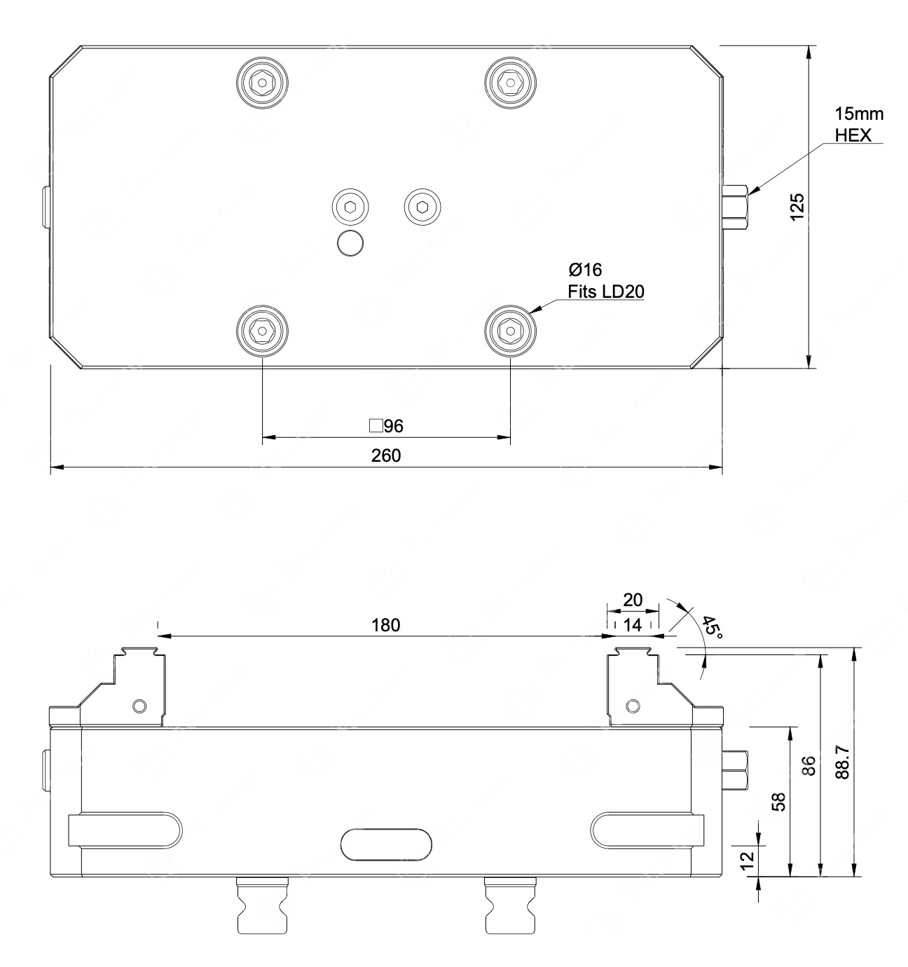 The TFG 125x260mm Self-Centering Vice is a high-capacity workholding solution engineered for heavy-duty CNC milling where both precision and high clamping forces are required. Designed specifically for the System 96 grid (Ø20mm studs), this vice offers an expansive 0–240mm clamping range, allowing it to bridge the gap between standard mid-sized vices and oversized production fixtures.