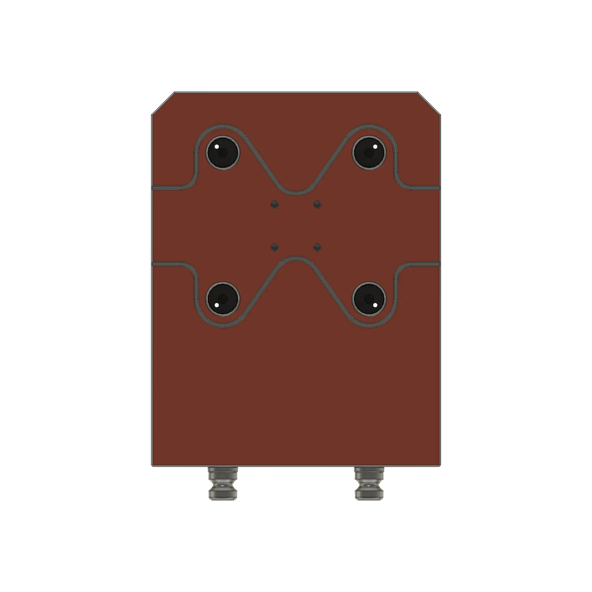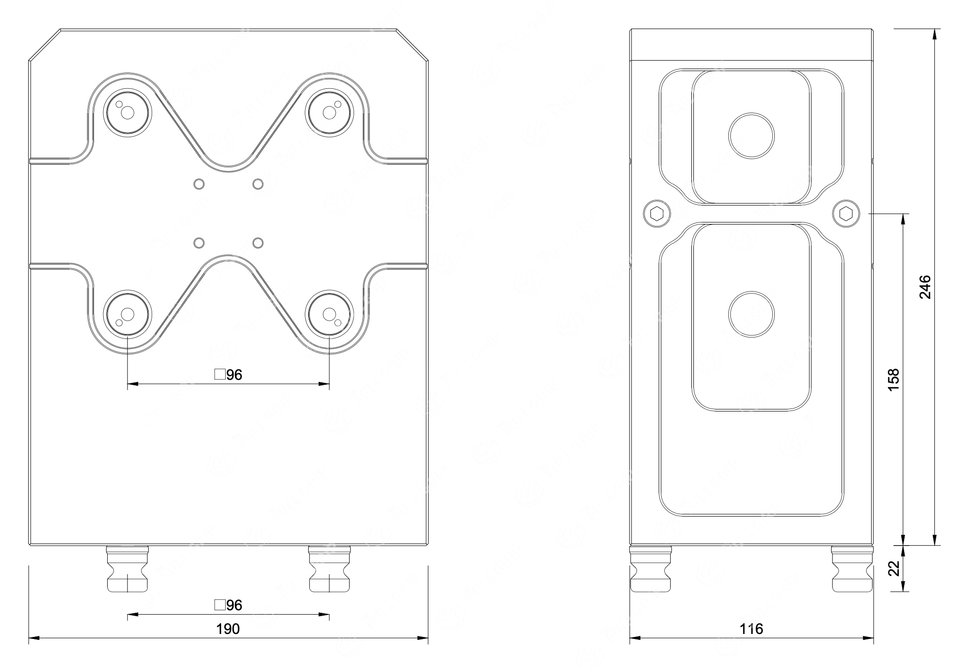 The TFG Double-Sided Tombstone is a high-density workholding riser engineered to double your part capacity in a single setup. Designed for the System 96 grid (Ø20mm studs), it features integrated zero-point receivers on both vertical faces, allowing you to run multiple vices or fixtures simultaneously.