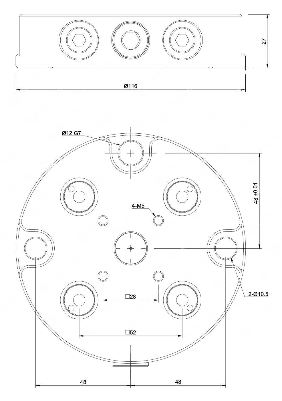 The TFG Round Zero-Point Plate (Ø116mm) is an ultra-compact, high-performance receiver engineered for precision CNC machining where space is at a premium. Designed specifically for the System 52 grid (Ø16mm studs), this plate allows for maximum spindle clearance and table utilization. Unlike many smaller receivers that compromise on strength, this plate is built from SUS440C Stainless Steel (HRC 55-58) and features a robust 4-rivet locking mechanism that delivers a massive 18KN of locking force. This unique combination of a small Ø116mm footprint and high-clamping rigidity makes it a standout in the 52mm category. With a repeatability of ≤ 0.005mm, it is ideal for 5-axis work, medical part manufacturing, and high-precision micro-milling where rapid, dead-accurate palletization of small vices or fixtures is essential.